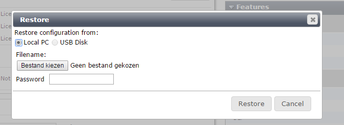 6. Vervolgens roep je het dashboard weer op en klik je op Restore. Fortinet geeft je de optie om het bestand te kiezen dat je wilt restoren in het device.