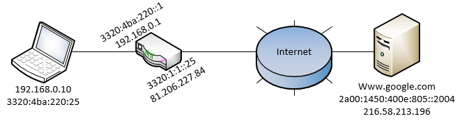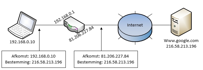 Wanneer de aanvraag voor “www.google.com” de laptop verlaat, gebruikt deze het privé IP adres (192.168.0.10). Wanneer deze een verbinding, via de router, naar het internet maakt, wordt het privé IP adres automatisch omgezet naar een publiek IP adres (81.206.227.84).