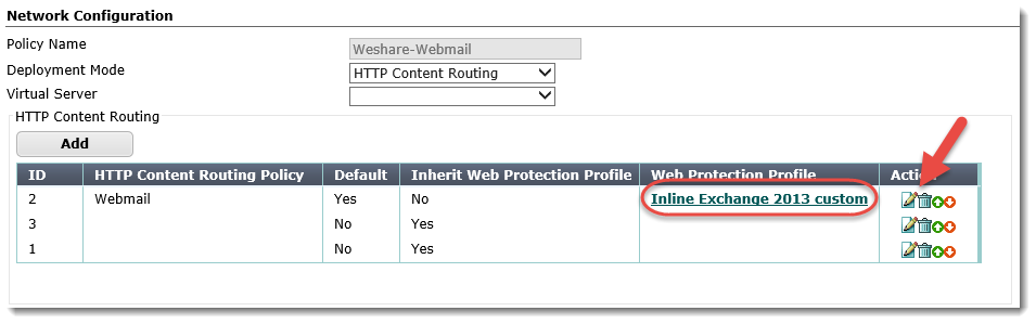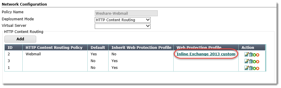 Bewaar de aanpassingen. Om nu te testen dienen we alleen nog de clone van het Protection Profile toe te wijzen aan de server policy. Selecteer je server en klik edit onder de module “Policy” -> [Server Policy] -> [Server Policy] in de tree. Pas nu het protection profiel aan voor de Webmail, met het net aangemaakte “Web Protection Profile”.